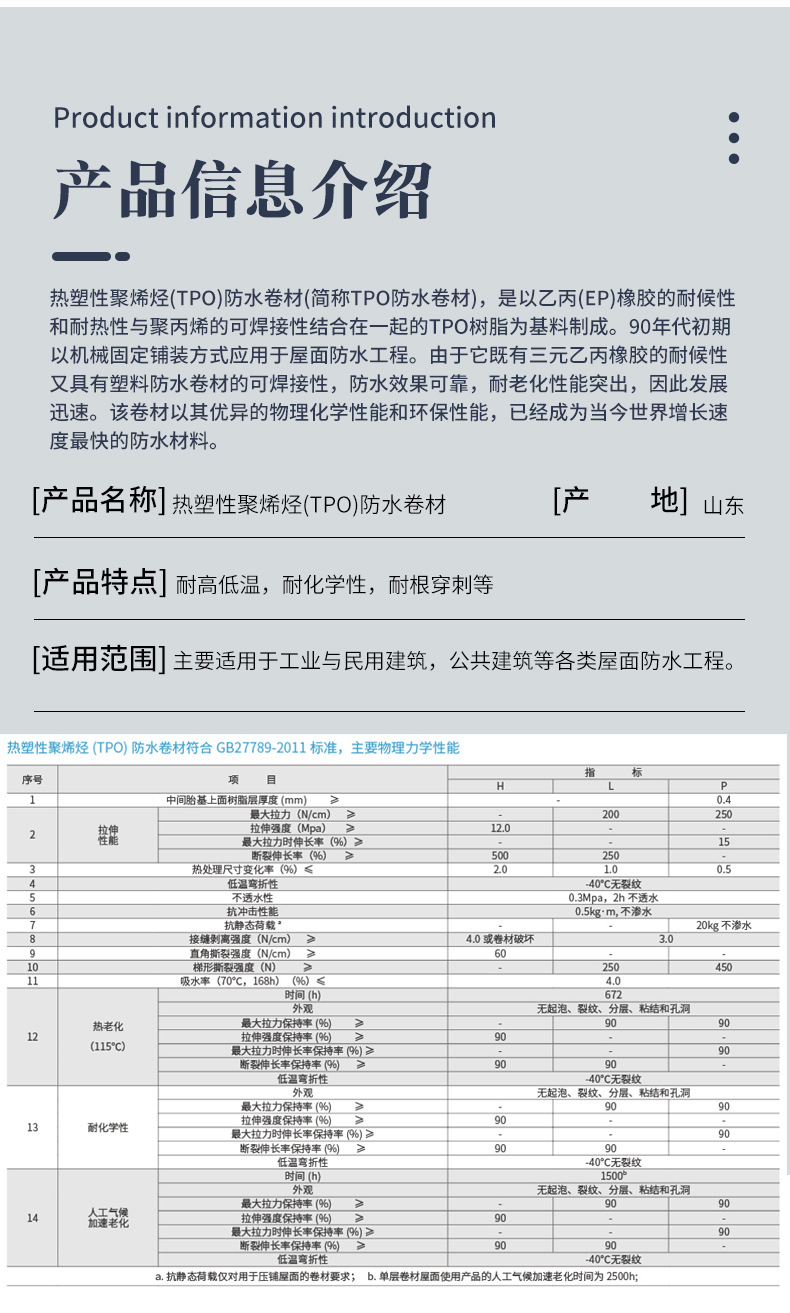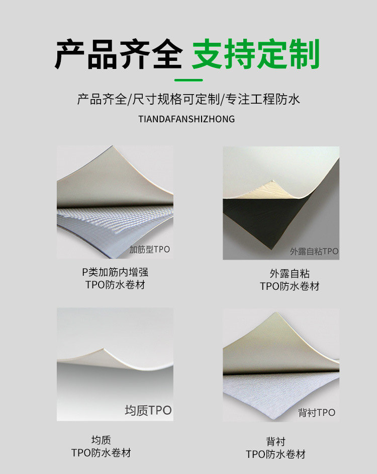 熱塑性聚烯烴(TPO)防水卷材是目前世界上最流行的防水材料。 采用先進(jìn)的聚合技術(shù)和擠壓技術(shù)制成的熱塑性彈性體防水材料,具有良好的力學(xué)性能、高抗拉強(qiáng)度、抗氧化、抗穿刺等特點(diǎn)。